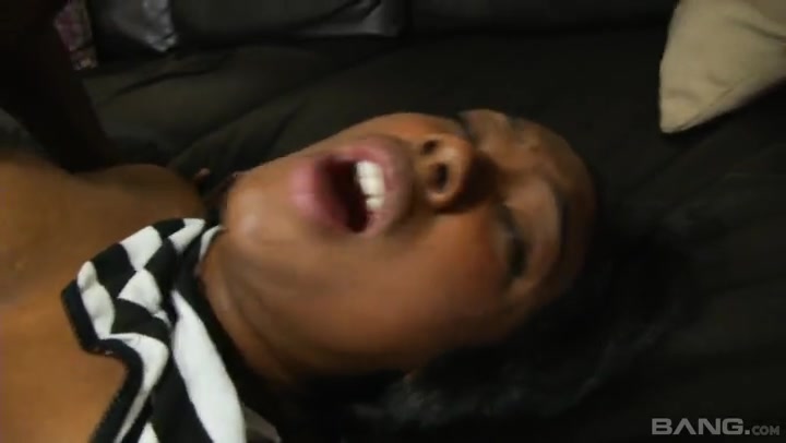 Ebony chick wearing fishnet stockings drilled in her pussy and her ass hole by huge boner