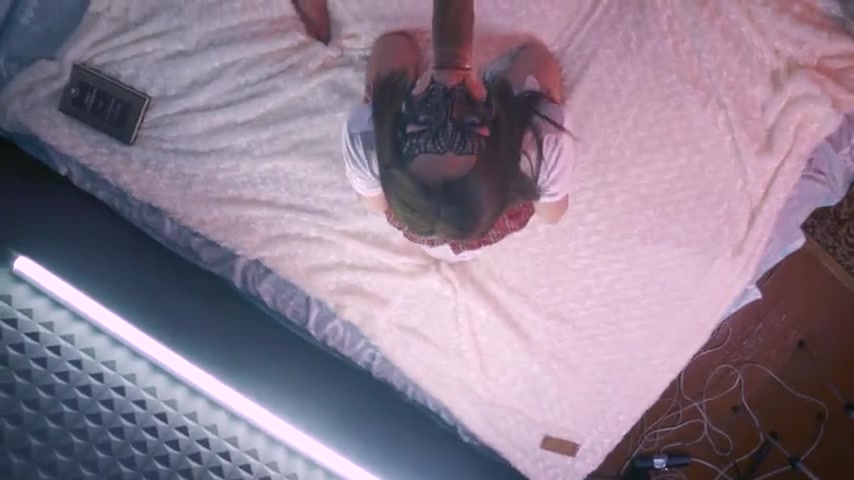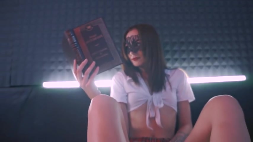 Masked brunette schoolgirl kneels and gives fellatio before gets her clam filled