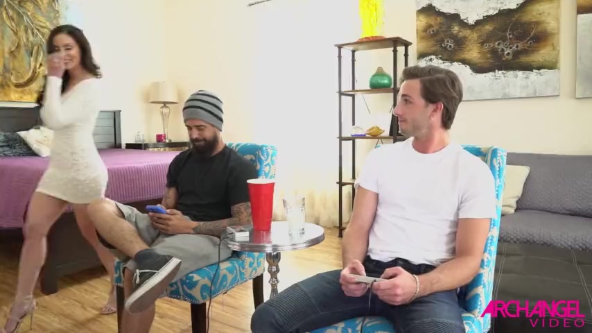 Two sultry big ass babes wearing fishnet dresses share a dude with a big pulsating...