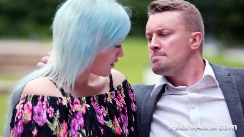 Blue haired teen Ashly Anderson sits on one stiff boner while getting other one anally